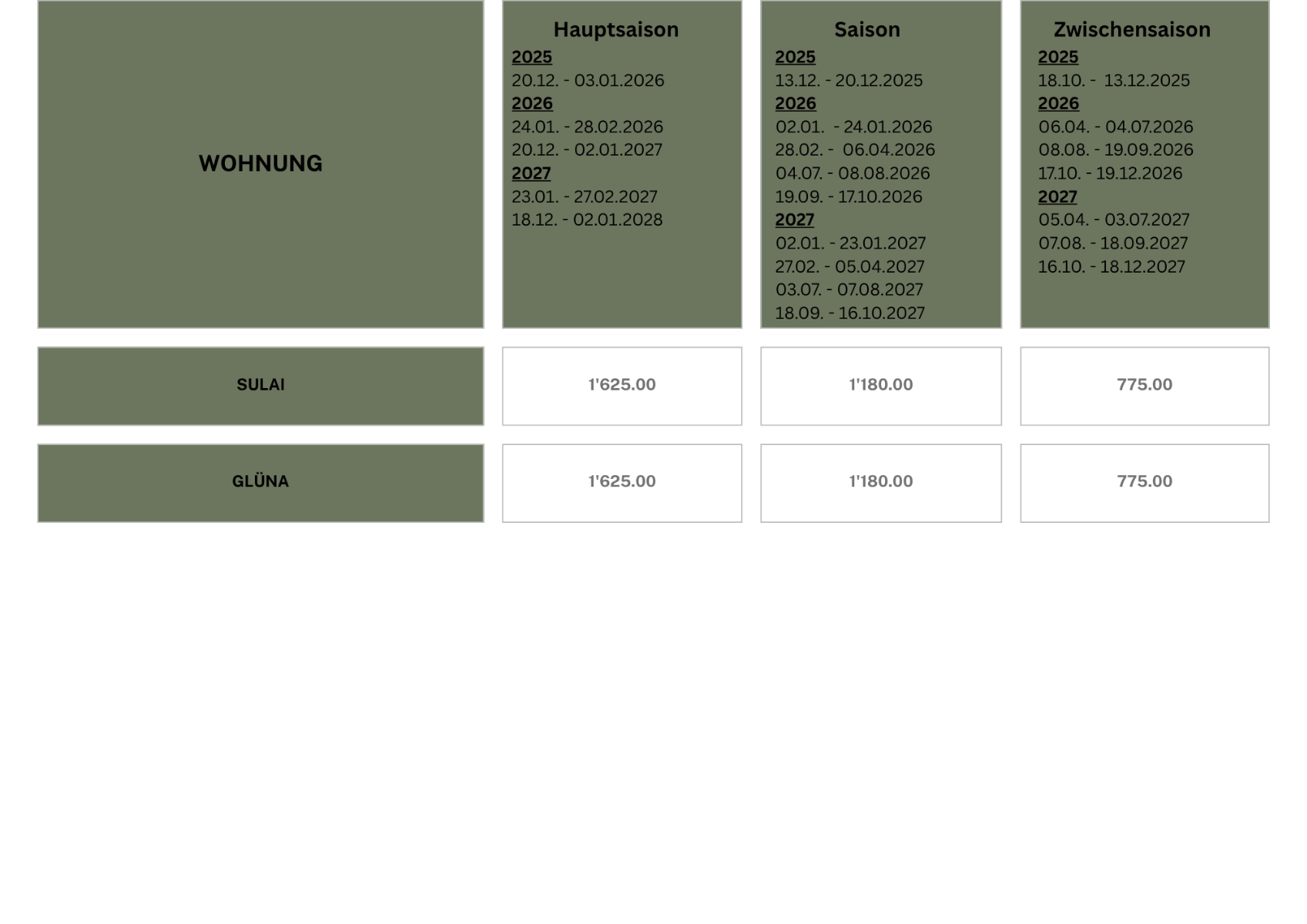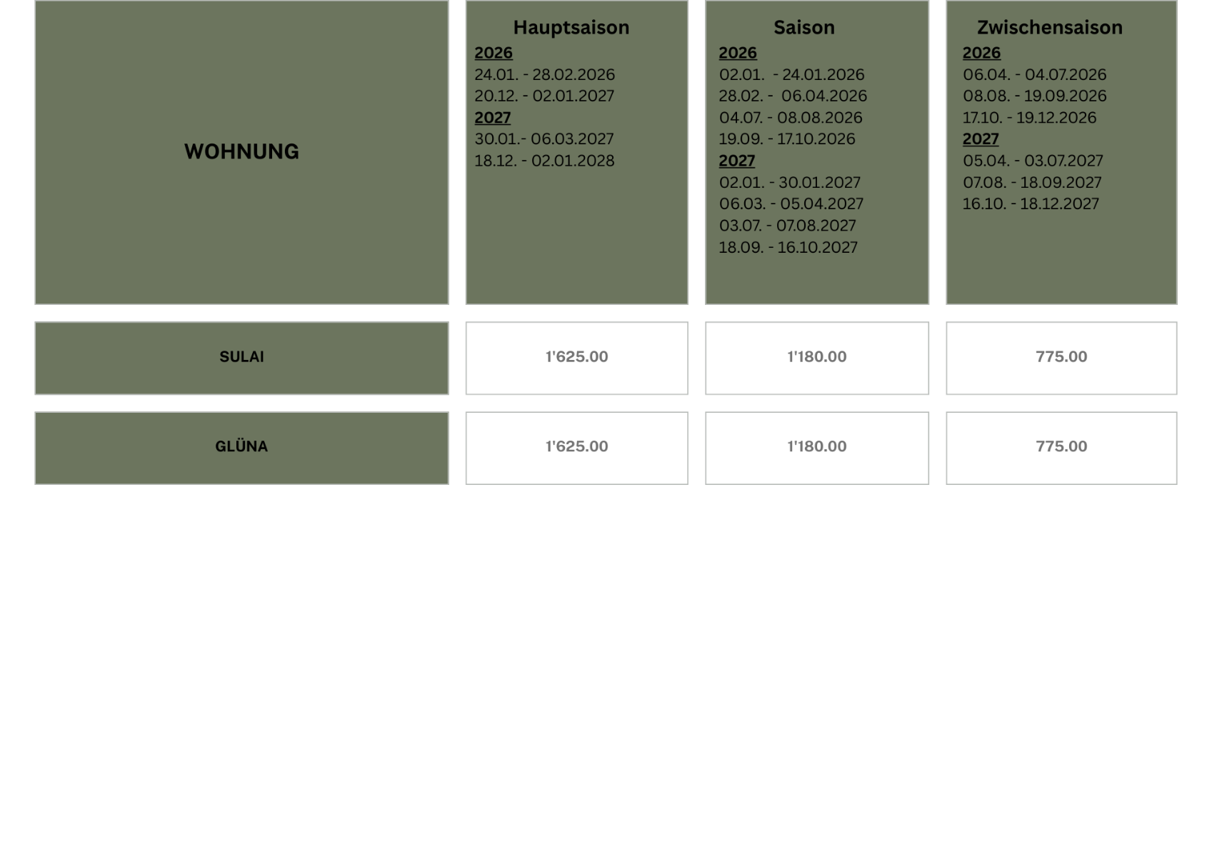 Wir weisen die Wochenpreise in CHF inkl. Mehrwertsteuer aus. Im Preis inklusive: Bett-, Bad-, Küchenwäsche. Die Endreinigung und Kurtaxen bezahlen Sie extra. Für die Endreinigung verrechnen wir CHF 150.00 pro Wohnung.